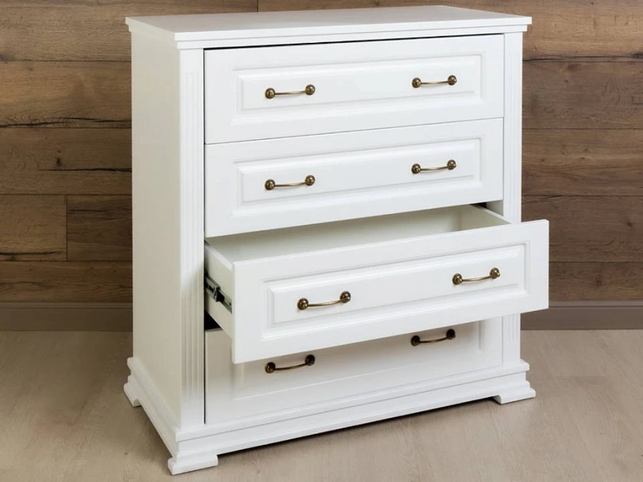 Milena - комод для тех, кто выбирает мебель один раз и надолго. Каркас и фасады из натурального массива, защитное лаковое покрытие, которое проявляет неповторимую текстуру дерева и никакой бумажной плёнки, которая вздувается через год. Четыре глубоких ящика на шариковых направляющих полного выдвижения делают хранение удобным, а вес 61 кг. говорит о плотности материала без лишних слов.